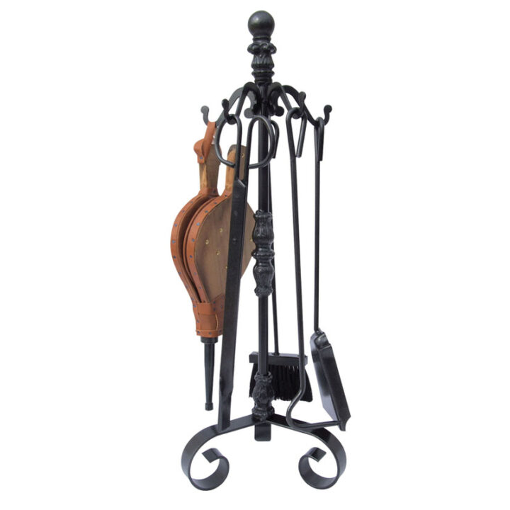 Este juego está fabricado en hierro forjado de alta calidad. Está compuesto por un cepillo una pala, pinzas, atizador y un fuelle. Viene presentado en una caja.