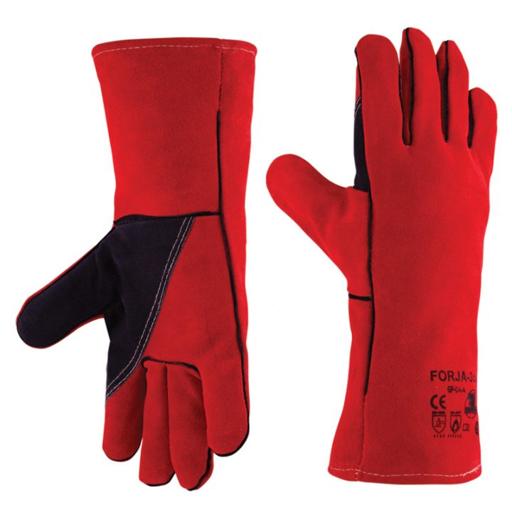 Guantes completos de piel vacuno crupón tipo serraje, color rojo burdeos, de grueso 1,2 mm. a 1,3 mm. La longitud total del guante es de 350 mm, incluye un refuerzo de serraje negro alrededor del dedo pulgar, así como manga ribeteada para incrementar la protección. Todos los cosidos están realizados con hilo KEVLAR y se encuentran forrados totalmente con tejido afelpado, por lo que ofrecen una alta calidad y confort. La longitud total de los guantes es 350 mm.