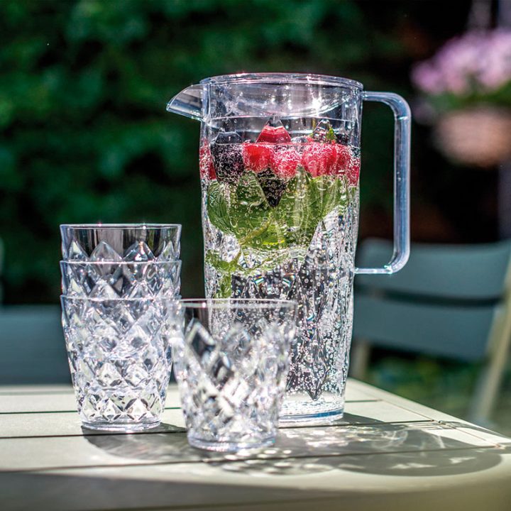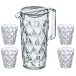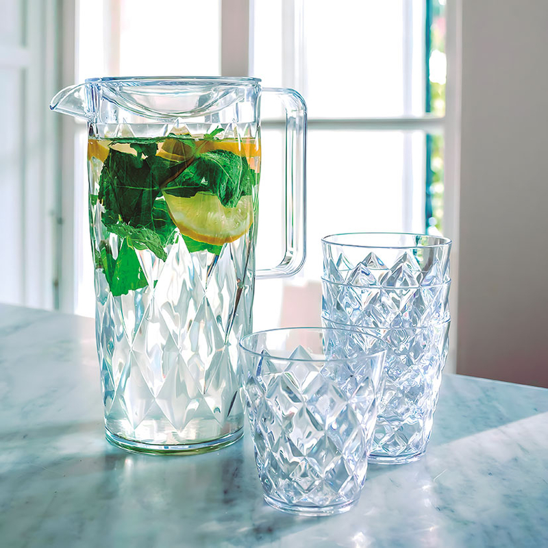 El juego de jarra más cuatro vasos del modelo Koziol está fabricado en plástico libre de BPA (cristal acrílico) y es 100% reciclado, ofrece una opción segura y respetuosa con el medio ambiente. El cristal acrílico, tiene un aspecto similar al cristal tradicional pero con la ventaja de ser más duraderos y resistente a roturas, ideal para su uso en exteriores o para evitar accidentes en el hogar. Cada vaso tiene una capacidad de 200 ml, perfectos para servir una variedad de bebidas, desde refrescos hasta cócteles. La jarra incluida en el juego complementa perfectamente los vasos, ofreciendo una capacidad suficiente para preparar y servir varias bebidas al mismo tiempo. Su diseño Koziol combina estilo y funcionalidad, convirtiéndola en una pieza destacada en cualquier mesa.