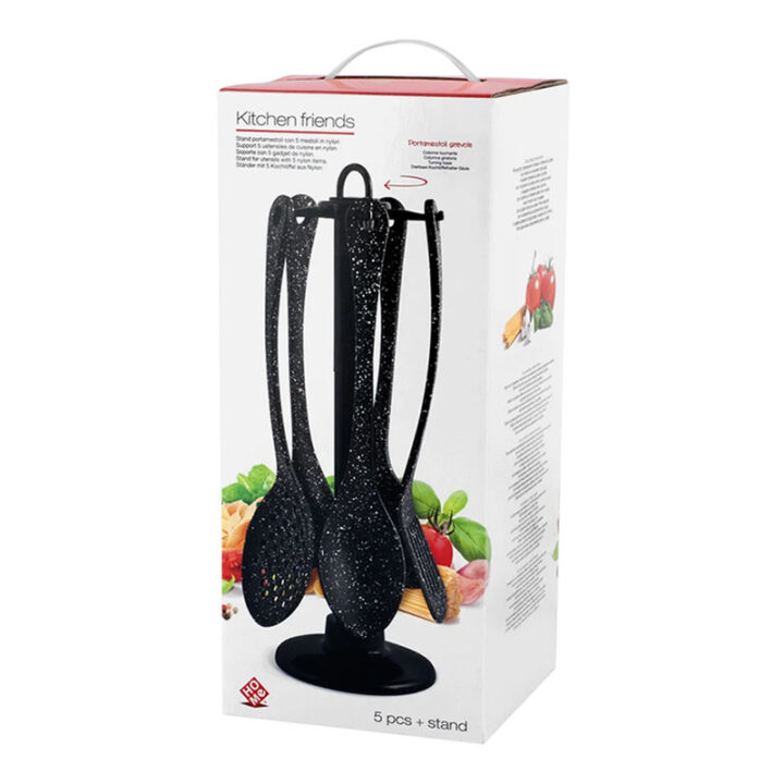 Práctico soporte de sobremesa que incluye un juego de 5 utensilios de cocina ideales para todo tipo de sartenes y cacerolas.