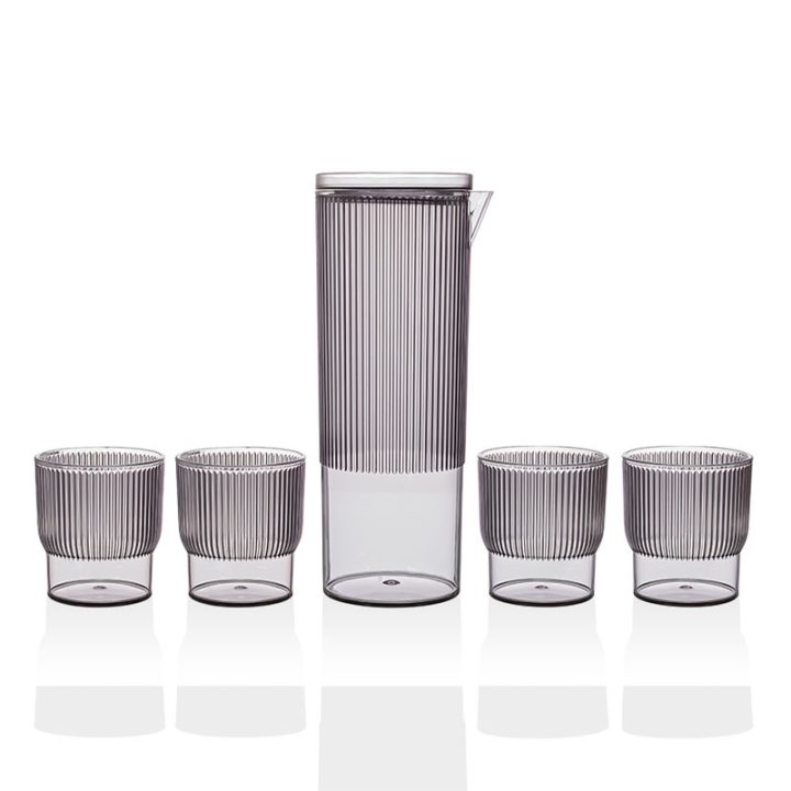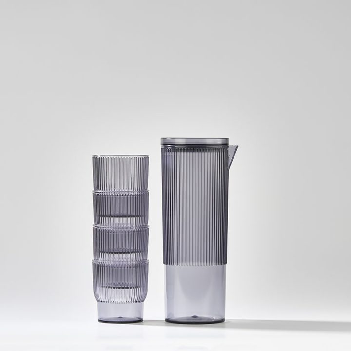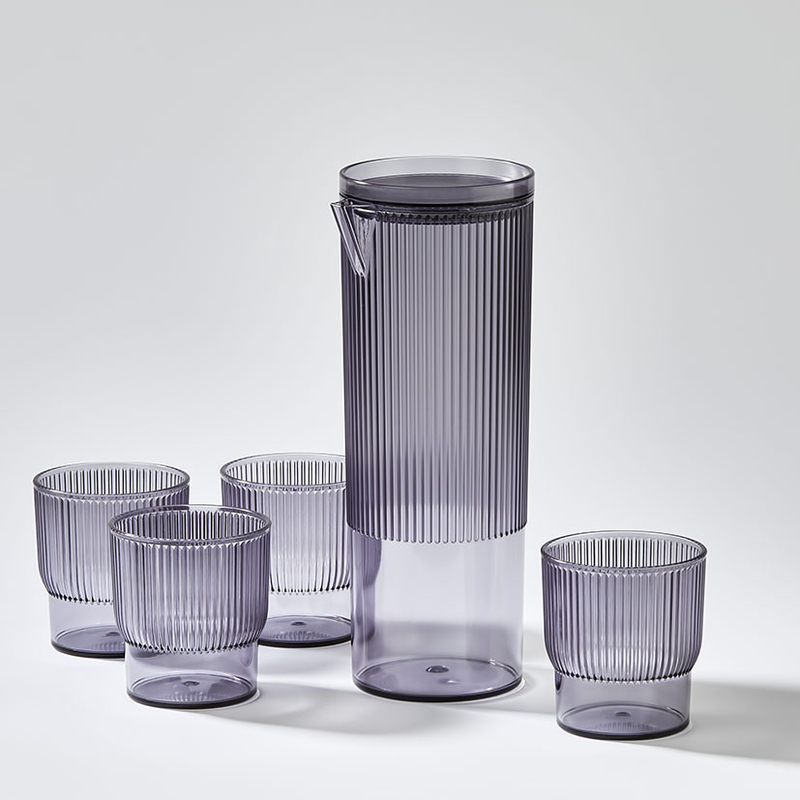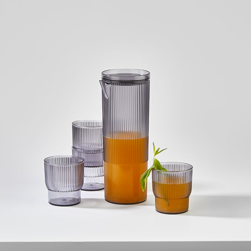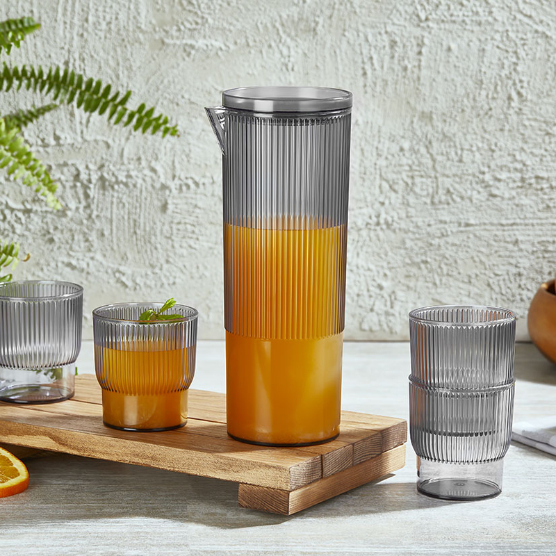 Este juego consta de 5 piezas en total, combinando una jarra y cuatro vasos, todos diseñados con un acabado en poliestireno que simula el aspecto del vidrio ahumado, pero con la ventaja de ser liviano y resistente.