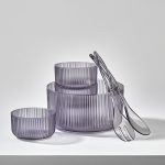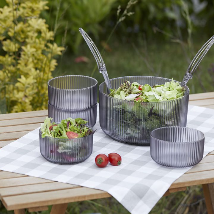 Está compuesto por piezas fabricadas en poliestireno de color gris ahumado, diseñadas para servir y presentar ensaladas y frutas de manera elegante. Incluye: