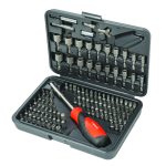Este juego está compuesto por 122 accesorios de atornillado fabricados en acero cromo-vanadio S2 y mango ergonómico antideslizante. El estuche es muy resistente, de material termoplástico ópaco que incluye bisagra central y un cierre delantero.
