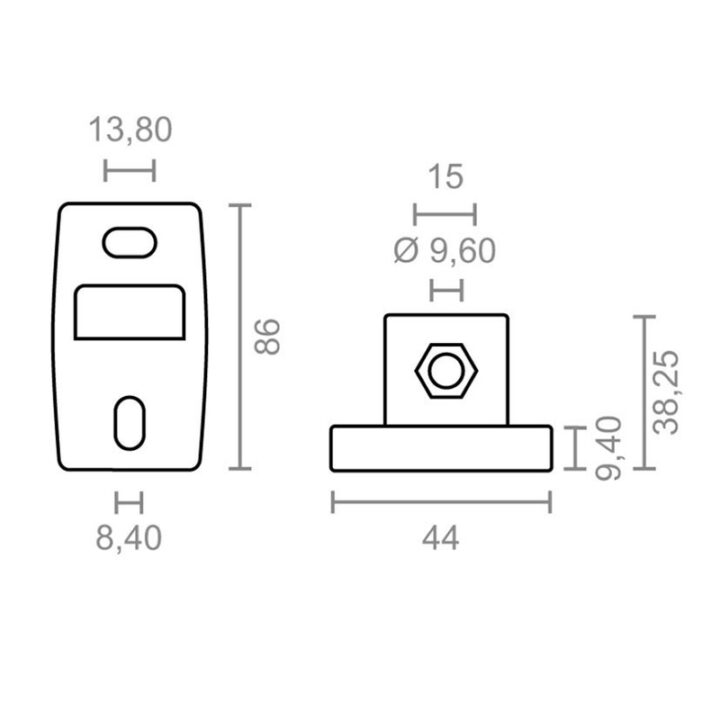 Este juego de soportes tiene unas medidas de 44×38.25×86 mm y está fabricado en aluminio de color blanco. El juego se presenta en una bolsa. Puedes consultar el croquis que tenemos colgado en la web.