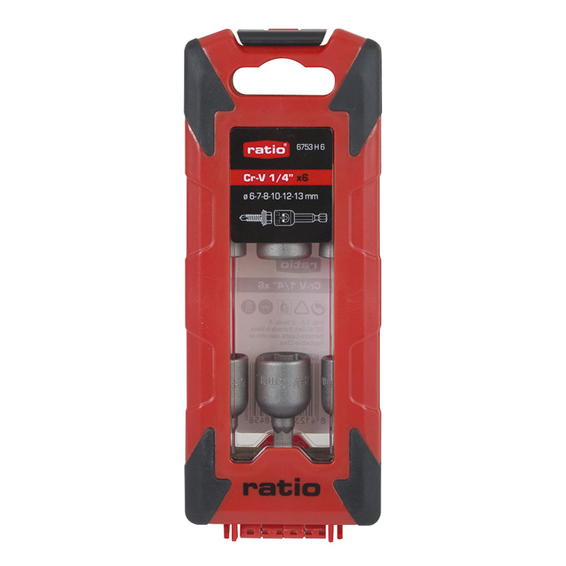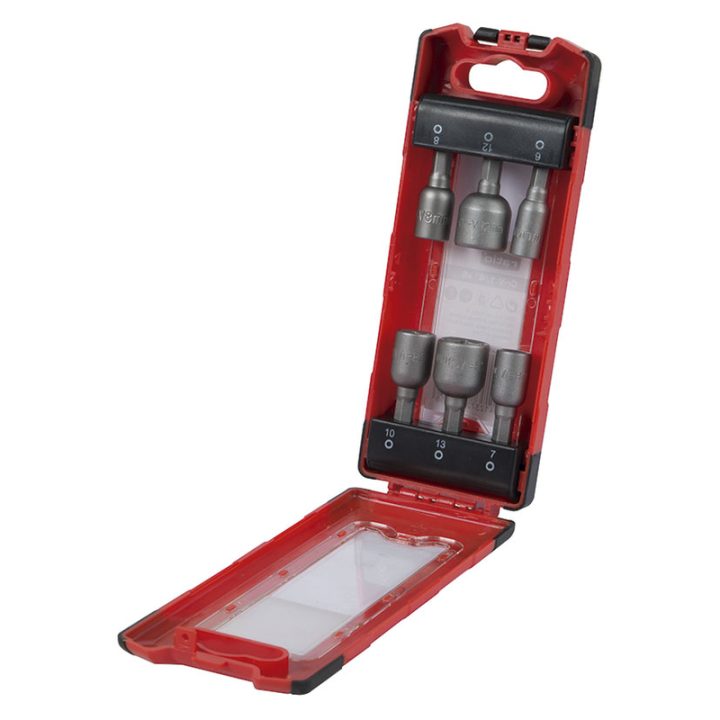 Estuche bimaterial de 6 puntas magnéticas Stecker de diferentes diámetros (6-7-8-10-12-13 mm). Están confeccionadas en acero cromo-vanadio y tienen conexión 1/4″. Se presenta en una caja.