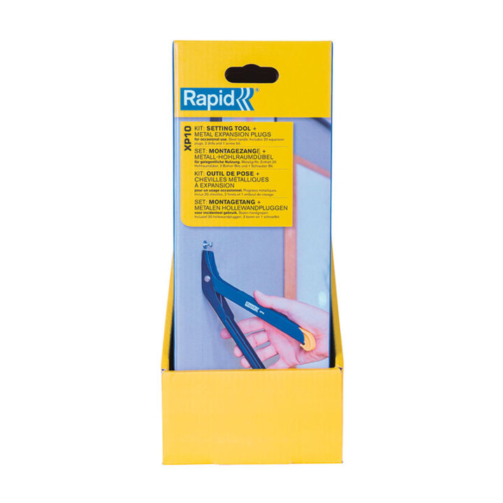 Proporciona una fijación eficaz de los tacos de expansión metálicos. Entre sus características se incluye un largo brazo de acero que permite tensar fácilmente el taco. La XP10 es ideal para os tacos de expansión metálicos M4 y M5 en placas de yeso simples. Se suministra en un kit que incluye 20 tacos de expansión una punta de destornillador y dos brocas del tamaño correspondiente. Una solución completa que permite a los usuarios aficionados realizar fijaciones rápidas y sin complicaciones en todo el hogar.