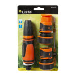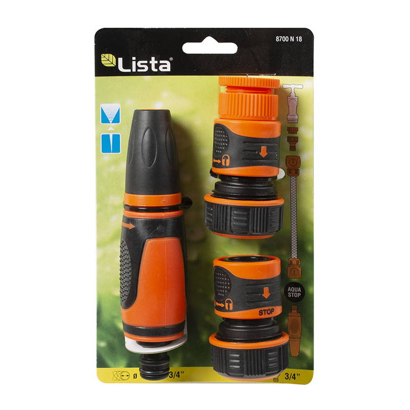 Se trata de un kit compuesto por un conector de grifo una lanza para regar y dos conectores rápidos, uno de ellos con cierre automático y válvula Aqua Stop que facilita la desconexión, sin salpicaduras, de los accesorios de la manguera. Viene presentado en blíster.