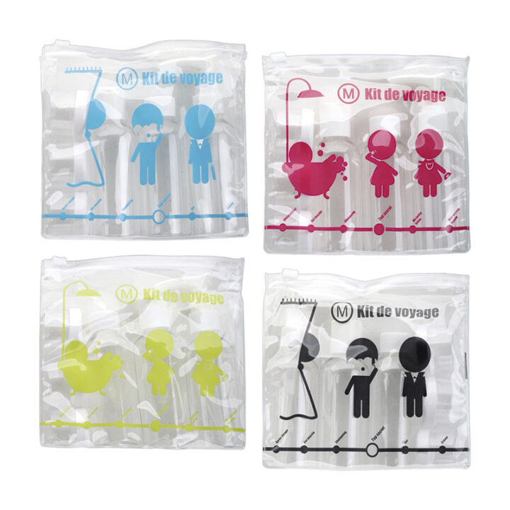 Todos los frascos se encuentran dentro de las limitaciones para viajar en avión. El kit está compuesto por 3 frascos uno de ellos con dosificador, 3 botes y un neceser transparente.