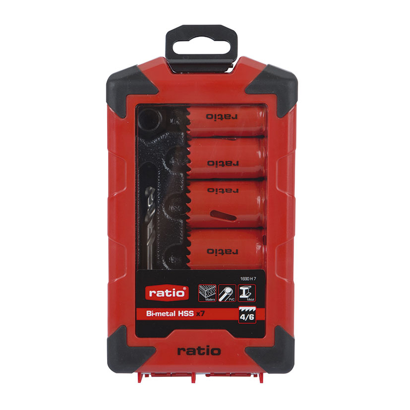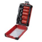 Este práctico juego de sierras corona de acero bimetal te permitirá mantenerlas todas ordenadas y a mano. Las sierras incluidas en el estuche cuentan con diente variable, con un paso de 4 a 6 dientes por pulgada. El estuche incluye 5 coronas de diferente diámetro (22-25-29-32-38 mm), un husillo y un adaptador. Se presenta en una caja.