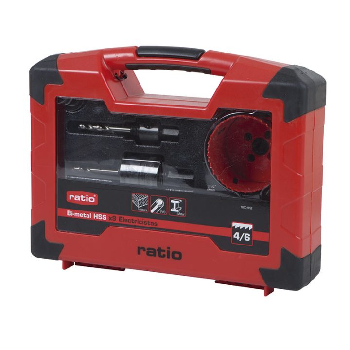 Este práctico juego de sierras corona de acero bimetal te permitirá mantenerlas todas ordenadas y a mano. Las sierras incluidas en el estuche cuentan con diente variable, con un paso de 4 a 6 dientes por pulgada. El estuche incluye 6 coronas de diferente diámetro (22-29-35-44-51-64 mm), dos husillos y un adaptador.