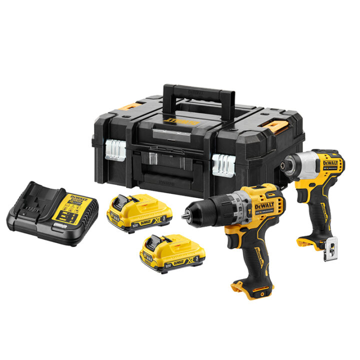 Kit ideal para un uso profesional compuesto por un taladro percutor DCD716 y el atornillador de impacto DCF801 más dos baterías 12V Li-Ion 3Ah y maletín TSTAK II
