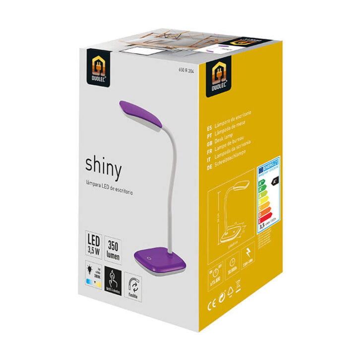 Lámpara fabricada en plástico de color lila con función táctil y 4 niveles de intensidad. Incorpora un Led que emite 350 Lumen de potencia a una temperatura 3000K. La puedes ajustar de forma flexible según precises. El grado de protección es de IP 20 y viene presentada en una caja.