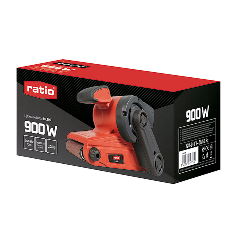La lijadora de banda R-L900 de RATIO cuenta con un potente motor de 900W que ofrece un gran rendimiento de lijado velocidad variable 150/270 rpm y empuñadura bimaterial antideslizante que te facilitará el agarre y manipulación de la herramienta. Incorpora sistema de recolección de polvo y un ajuste del sistema de centrado de la correa. Incluye 1 hoja de lija. Se presenta en caja.