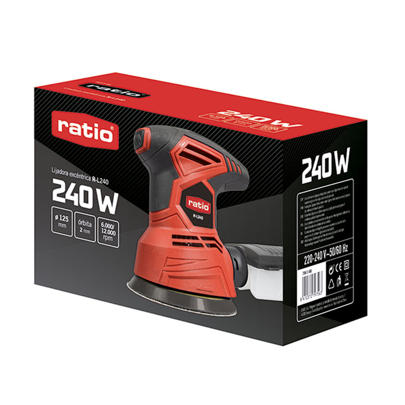 La lijadora excéntrica R-L240 de RATIO es extraordinariamente potente y ligera. Cuenta con un gran rendimiento de lijado velocidad variable y caja de extracción polvo ciclónico para mantener la superficie limpia y obtener una mayor visibilidad. Incluye empuñadura bimaterial, que te facilitará el agarre y manipulación de la herramienta, y un maletín de transporte con 6 hojas de lija, para que puedas guardarla cómodamente o llevarla donde precises. Se presenta en una caja.