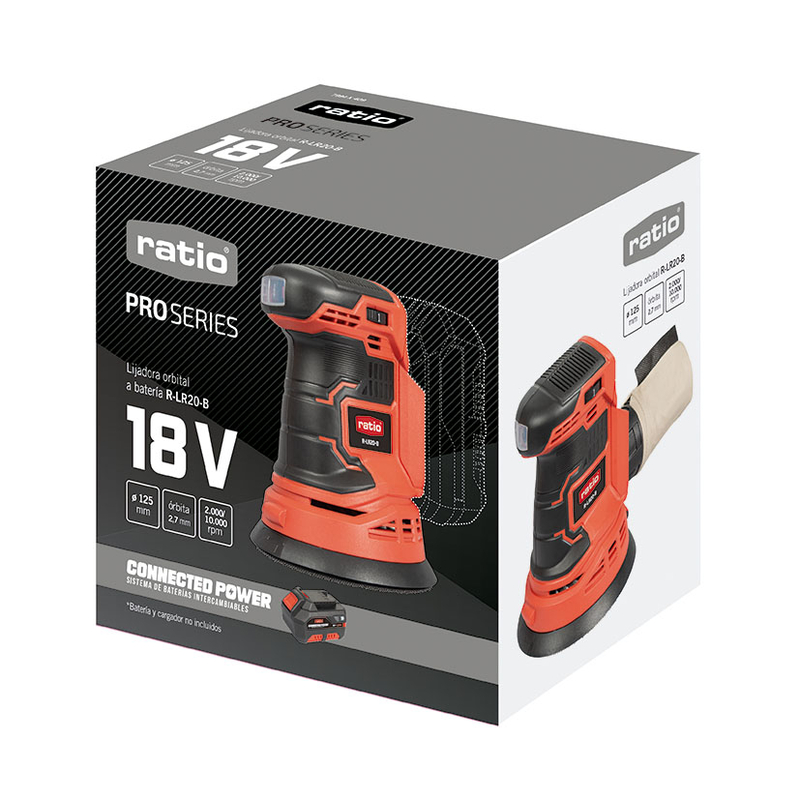 La lijadora excéntrica RATIO ProSeries RLR20-B es extraordinariamente potente y ligera. Cuenta con un gran rendimiento de lijado, velocidad variable, 2000-10000 rpm, y caja recoge polvo ciclónico. Incluye empuñadura bimaterial antideslizante, que te facilitará el agarre y manipulación de la herramienta. Dispone del sistema de baterías Connected Power, batería extraíble e intercambiable con toda la gama de herramientas de esta misma serie. El diámetro de la base es de 125 mm. La batería y el cargador no están incluidos, se venden por separado. Incluye 2 hojas de lija y 1 saco recogepolvo. Nosotros disponemos de batería 2.0, 4.0 y 5.0 Ah en nuestra Web. Se presenta en una caja.
