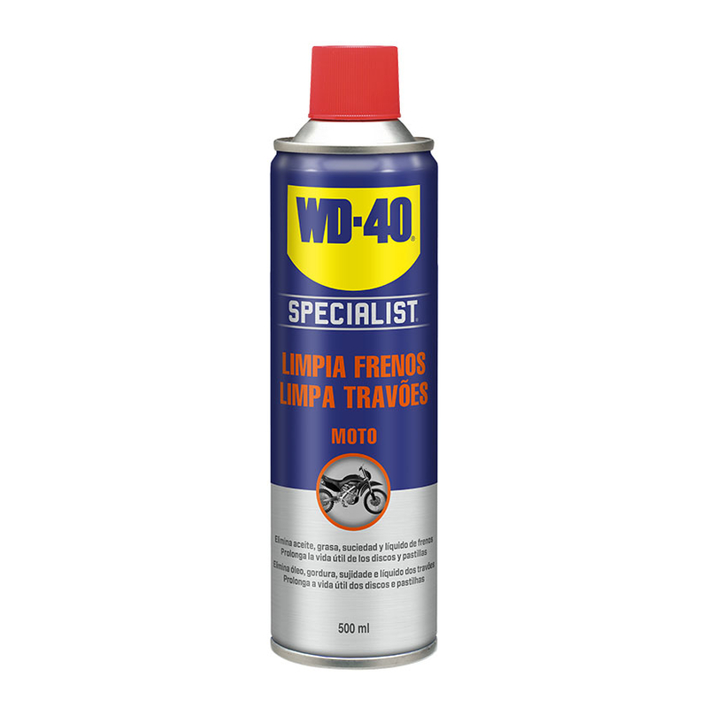 El WD-40 Specialist Moto Limpia Frenos es un spray de secado rápido, diseñado para disolver los residuos de grasa, aceite, líquido de frenos y polvo de los discos y componentes del sistema de frenado.