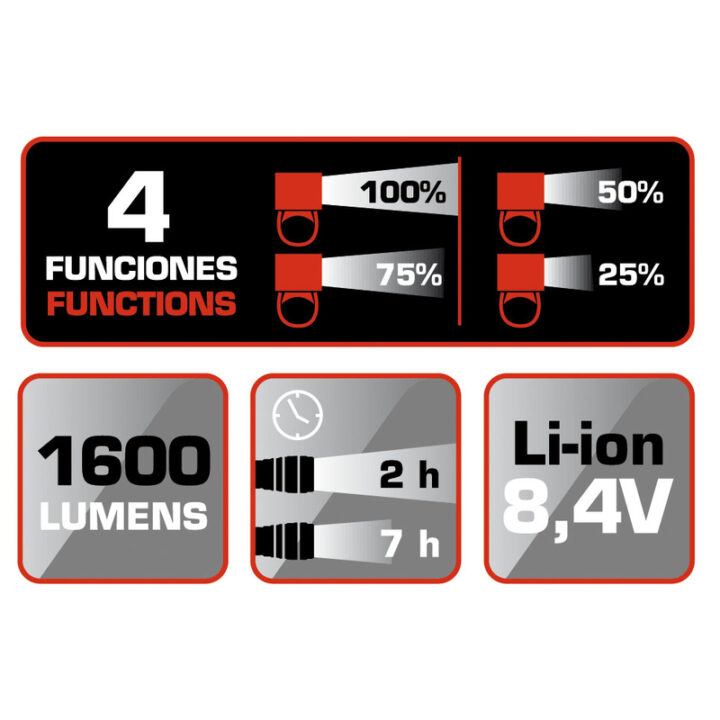 El cabezal es de aluminio e incorpora 4 LEDS de alto rendimiento CREE XP-G que aportan una potencia máxima de 1600 lumen con un alcance de hasta 500 metros. Dispone de 4 funciones de intensidad de luz: 100%, 75%, 50% y 25%. Funciona con una batería de Li-ion 8,4V/4 de 400 mAh que proporciona una autonomía de aprox. 2 a 7 horas según la intensidad. Tiene un indicador luminoso de nivel de carga de la batería y un interruptor 2 posiciones (+/- potencia). Con la linterna viene incluido: 1 kit adaptador de corriente de 230 V, 1 petaca batería, 2 anillos de goma para que la puedas instalar en el manillar de tu bicicleta. Se presenta en una caja.