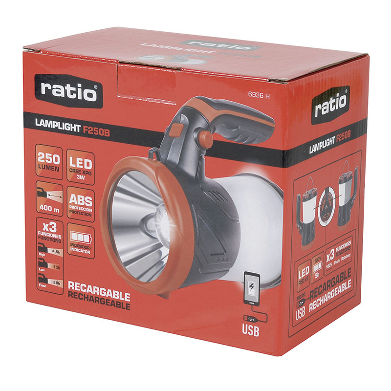 Incorpora una batería Li-ion de 3,7 V. LED CREE PG 3 W. Tiene una vida útil de aproximadamente 100.000 horas. Tiempo de carga de 5 horas. Indicador de estado de carga y proteccion contra sobrecargas. Tiene, también, una correa para el hombro y un cable micro USB. Potencia máxima de 250 lumen. Alcance máximo de 400 metros.