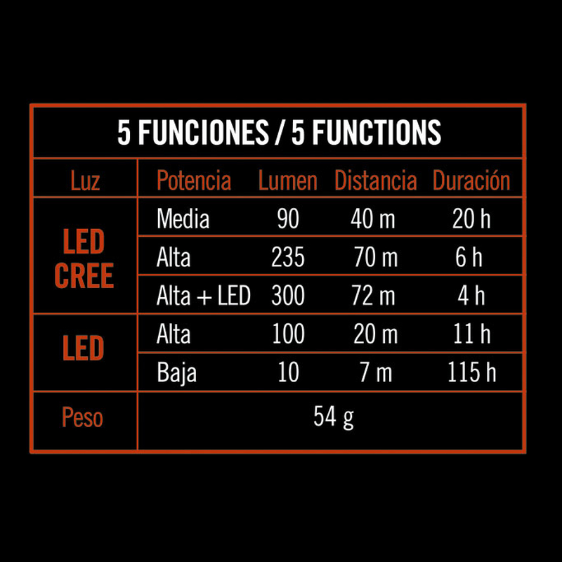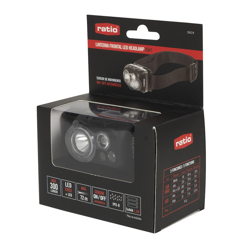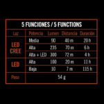 Con LED CREE de potencia de 300 Lumen y un alcance máximo de 72 m. Dispone de un sensor de movimiento automático que se activa de 7 a 15 cm. Podrás seleccionar 3 intensidades: media y alta alta + Led Cree y 2 intensidades: alta y baja en el modo Led. Funciona con 3 pilas AAA que no vienen incluidas. Tiene una impermeabilidad de IPX-8. Se presenta en una caja.