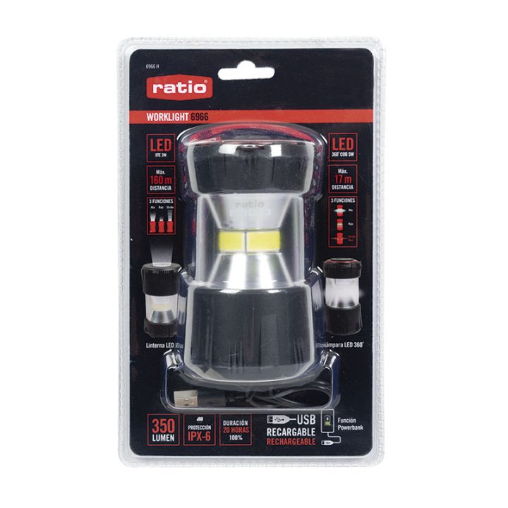 Está indicada para actividades al aire libre, mecánica, electricidad y otros. Tiene 5 funciones: 100%, 50%, 25%, estroboscópica y SOS.