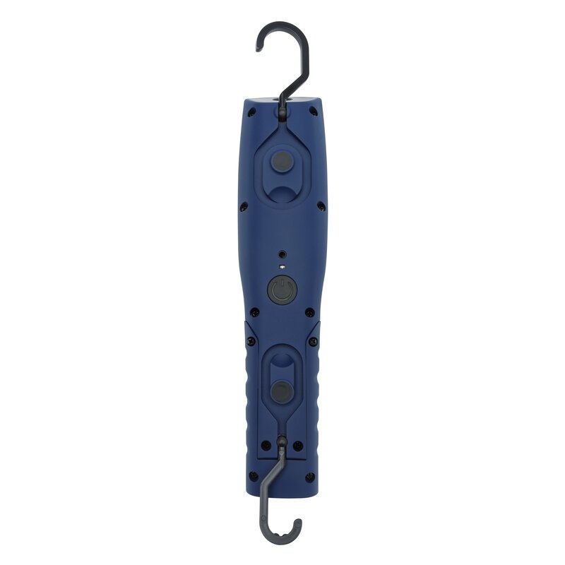 Potente linterna y lámpara LED recargable con un nuevo y moderno diseño. Cabeza inclinable hasta 180 grados. Tres soportes magnéticos y dos ganchos de suspensión ajustables y retráctiles. La linterna se recarga fácilmente a través del cable USB incluido. Incluye batería recargable 3.7V / 2200 mAh Li-ion.