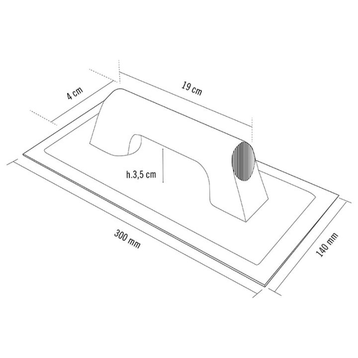Llana rectangular confeccionada en plástico, especial para trabajos de albañilería. Cuenta con mango cerrado, base de bordes flexibles y unas dimensiones de 300×140 mm.