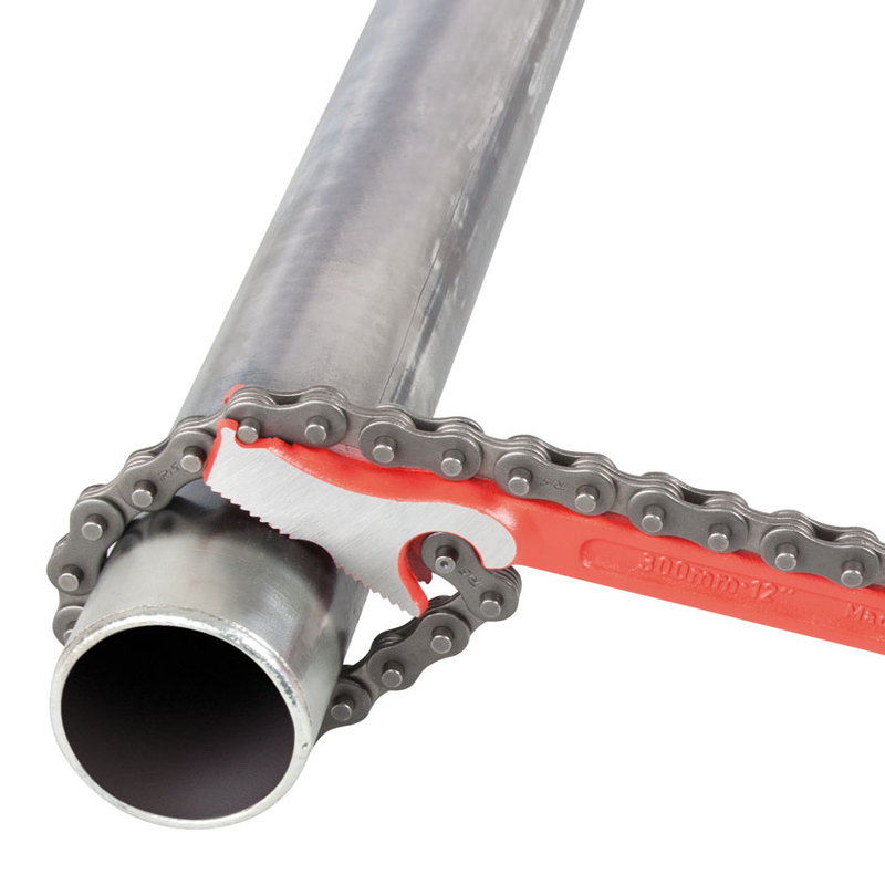 La llave ha sido fabricada en acero cromo-vanadio para asegurarle una mayor vida útil y evitar la corrosión. La longitud de la cadena es de 439 mm. Está especialmente pensada para tubos con un diámetro máximo de aproximadamente 10 cm para aflojar la tubería sin cambiar la posición de la llave. Se presenta en doble blíster.