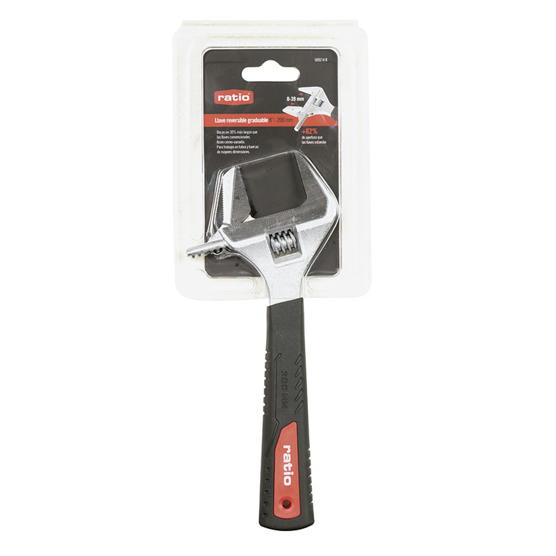 La llave graduable extra-ancha Super Wide con abertura de bocas de 0-39 mm +62% y un 30% más largas. Está fabricada en acero cromo-vanadio de gran calidad. La empuñadura que cubre el mango macizo es ergonómica y antideslizante. Dispone de escala milimétrica muy precisa y es de fabricación nacional. Esta llave es reversible, resistente, de gran calidad y recomendable para todo tipo de usuarios, por lo que la hace imprescindible en tu caja de herramientas. Las llaves de la marca RATIO son sinónimo de calidad, garantía y seguridad. Viene presentada en doble blíster. Puedes completar la información de esta llave, consultando la ficha técnica que tenemos colgada en nuestra web.