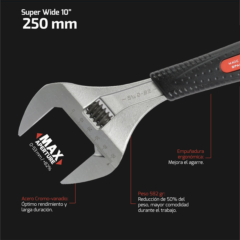 Calidad, seguridad y confianza en esta llave extra-ancha sensible en su graduación y adaptable, poderosa y contundente en su función.