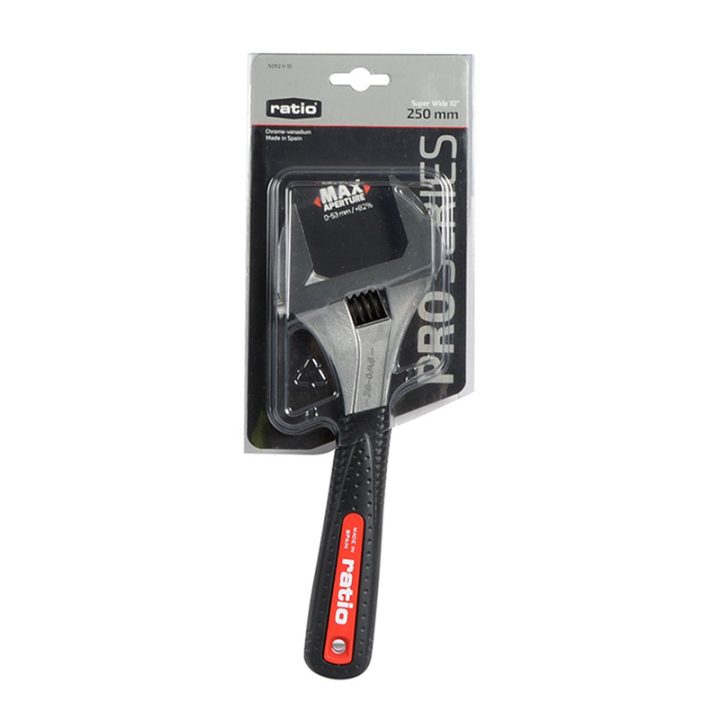 La llave graduable extra-ancha Super Wide, con abertura de bocas de 0-53 mm + 82%, está fabricada en acero cromo-vanadio de gran calidad. La empuñadura que cubre el mango macizo es ergonómica y antideslizante. Dispone de escala milimétrica muy precisa y es de fabricación nacional. Esta llave es resistente, de gran calidad y recomendable para todo tipo de usuarios, por lo que la hace imprescindible en tu caja de herramientas. Las llaves de la marca RATIO son sinónimo de calidad, garantía y seguridad y viene presentada en doble blíster.