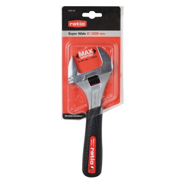 La llave graduable extra-ancha Super Wide, con abertura de bocas de 0-39 mm +62%, está fabricada en acero cromo-vanadio de gran calidad. La empuñadura que cubre el mango macizo es ergonómica y antideslizante. Dispone de escala milimétrica muy precisa y es de fabricación nacional. Esta llave es resistente, de gran calidad y recomendable para todo tipo de usuarios, por lo que la hace imprescindible en tu caja de herramientas. Las llaves de la marca RATIO son sinónimo de calidad, garantía y seguridad y viene presentada en doble blíster.