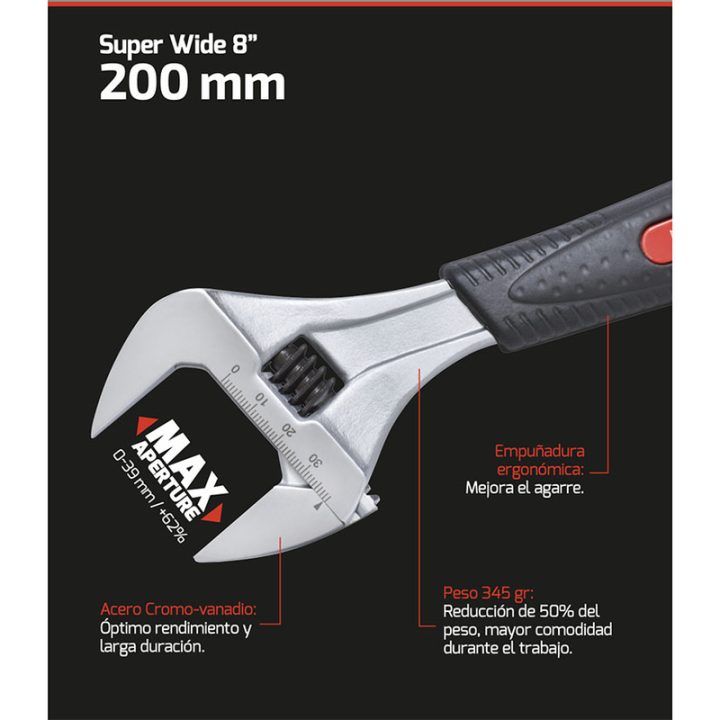 Calidad, seguridad y confianza en esta llave extra-ancha sensible en su graduación y adaptable, poderosa y contundente en su función.