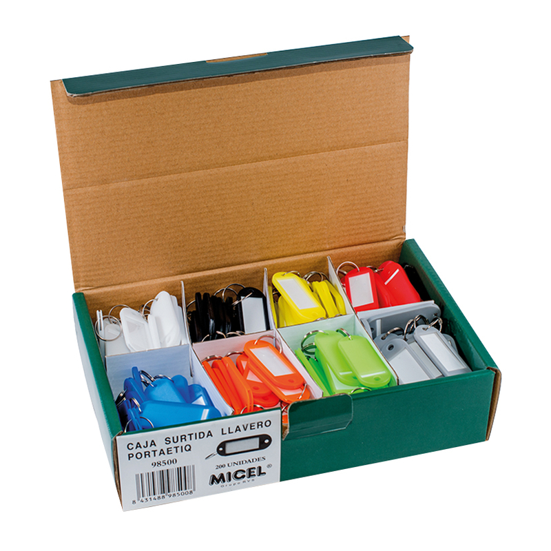 Este llavero está formado por una anilla metálica muy fácil de manipular cuando debas añadir o quitar llaves, pero de gran seguridad, así como por un soporte de plástico con etiqueta, que te permitirá mantener identificadas y diferenciadas todas tus llaves. Se presenta en una bolsa de 200 unidades en colores surtidos.