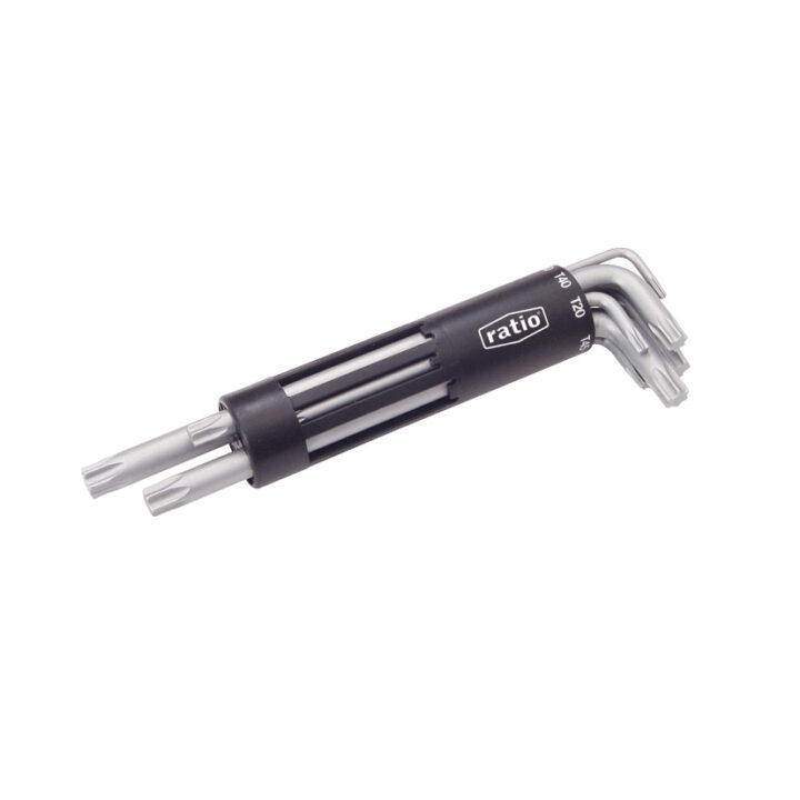 Llave Torx RATIO 6296H8. De uso común en automóviles, equipos automatizados y componentes informáticos, entre mucho otros. A diferencia de las llaves Allen, las llaves Torx cuentan con una barra circular en lugar de hexagonal y extremos en forma de estrella de seis puntas. Por su diseño, los tornillos de cabeza Torx resisten muy bien el efecto cam-out, es decir, que la varilla del destornillador resbale o se deslice indeseadamente del tornillo. Este juego de 8 llaves Torx de la marca RATIO destaca por su resistencia y excelente calidad de cada una de sus piezas de diferentes medidas (T-10-15-20-25-30-40-45-50). Las llaves están confeccionadas en cromo-vanadio y se presentan en un práctico soporte de plástico especial. Se presenta en un blíster.