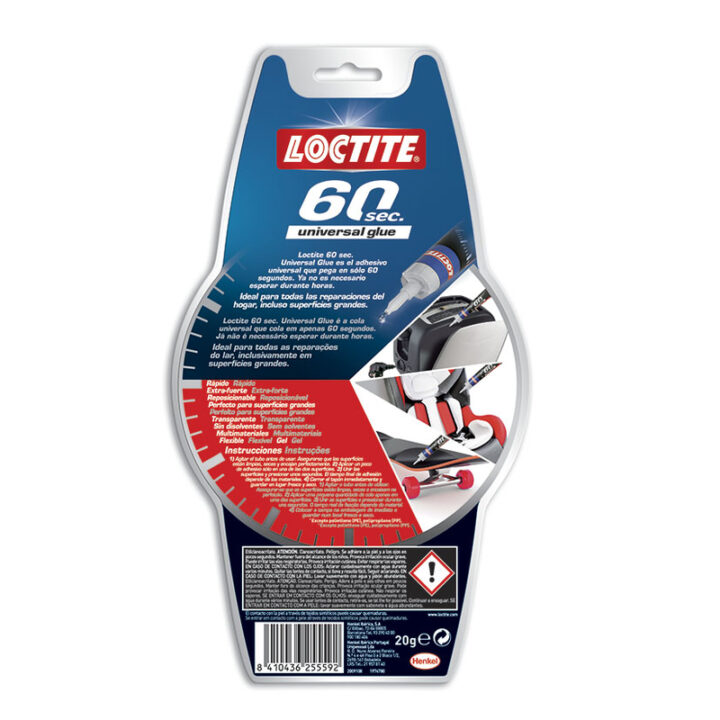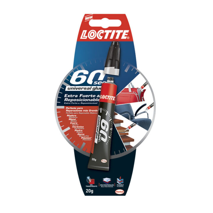 Loctite 60 sec. Universal Glue es el adhesivo universal transparente que pega en sólo 60 seg. Ideal para todas las reparaciones del hogar incluso superficies grandes y verticales gracias a su fórmula gel que evita el goteo.