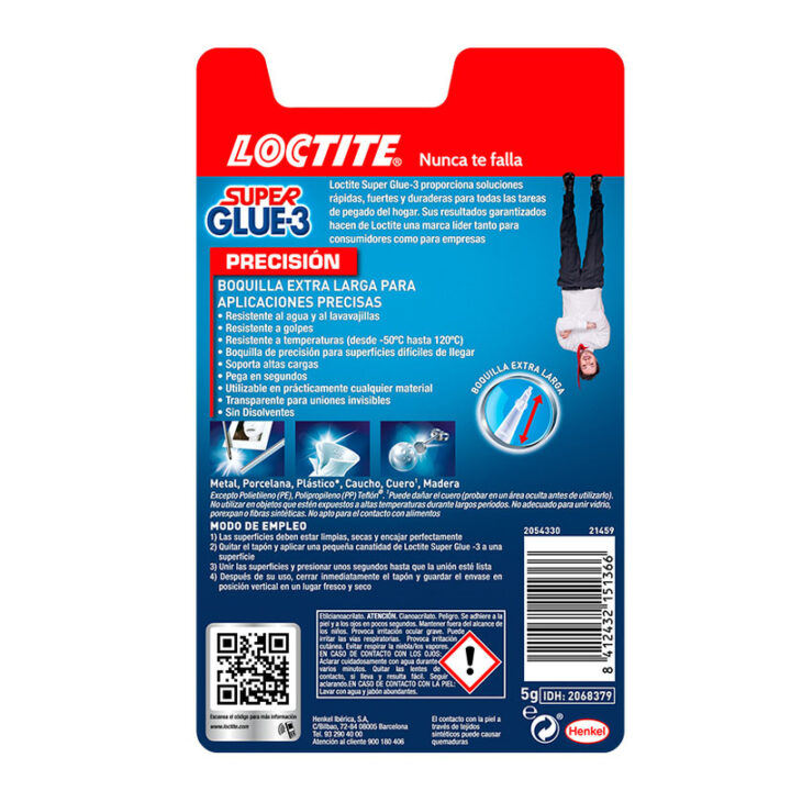 Loctite Super Glue-3 Precisión es un adhesivo instantáneo transparente que proporciona máxima fuerza de unión en pocos segundos. Ofrece una fácil regulación del goteo gracias a su boquilla extra larga para una precisión absoluta que permite llegar a los rincones de más difícil acceso. Especialmente indicado para un uso frecuente.