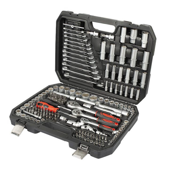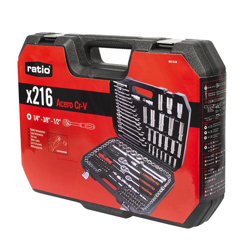 Maletín con 216 piezas fabricadas en acero cromo-vanadio de gran calidad. Las piezas tienen un acabado satinado para proteger la oxidación, los mangos de los destornilladores de plástico vienen con refuerzos engomados antideslizantes. Los vasos tienen un sistema de bloqueo Locksystem que te permitirá trabajar con comodidad y seguridad. El maletín es rígido y está fabricado en termoplástico, ligero y resistente.