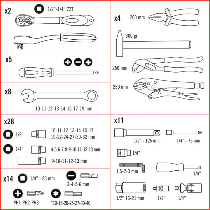 Maletín con 95 piezas fabricadas en acero cromo-vanadio de gran calidad. Las piezas tienen un acabado satinado que protege de la oxidación y los mangos de los destornilladores y los alicates son de plástico con refuerzos engomados antideslizantes. Los vasos son de 1/2 y de 1/4 y tienen un sistema de bloqueo Locksystem que te permitirá trabajar con comodidad y seguridad. El maletín es rígido y está fabricado en termoplástico ligero, resistente. Puedes consultar la ficha técnica que tenemos colgada en la web, donde puedes ver el contenido del mismo. Se compone:
