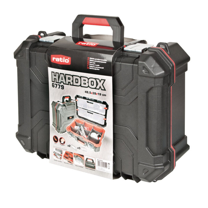 Este práctico y completo maletín de 49 5x39xh.19 cm, es la elección más acertada si quieres proteger y ordenar tus utensilios de trabajo de manera profesional. Su estructura de polipropileno y polietileno le dota de una gran resistencia y dureza, su empuñadura ergonómica antideslizante te otorga confort durante su transporte, y los cierres metálicos y hueco para candado te permiten guardar tus enseres de manera más segura. Para garantizar una buena organización, el HardBox de RATIO incluye: 2 estuches organizadores integrados en la tapa interior (con 6 separadores removibles cada uno) y cubeta inferior (con 2 separadores largos y 5 separadores cortos).