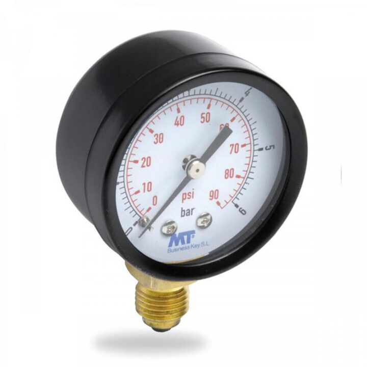 Manómetro de esfera seca de 50 mm de diámetro con conexión inferior BSP. Caja y anillo de cierre fabricados en acero negro casquillo adaptador, interior y conexiones en latón, dial y aguja indicadora en aluminio. Además soporta una temperatura ambiente desde -20 hasta 60ºC. La precisión es de +- 1/6%.