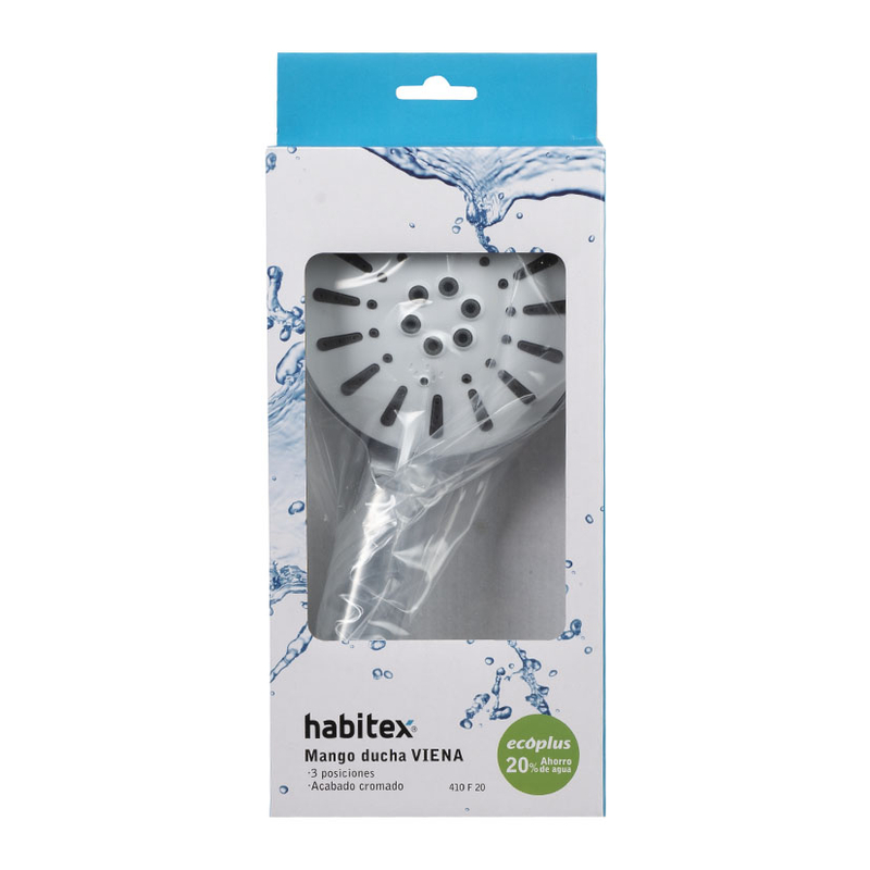 El cabezal o mango de la ducha es necesario en tu bañera o ducha. Puedes encontrar en nuestra web el que mejor se adapte a tus necesidades. El mango o cabezal de ducha HABITEX Viena es standard. Está fabricado en plástico ABS cromado con el frontal en blanco. Además dispone de sistema antical para una mayor durabilidad y limpieza. Con este mango ahorrarás un 20 % de agua. Viene presentado en una caja.