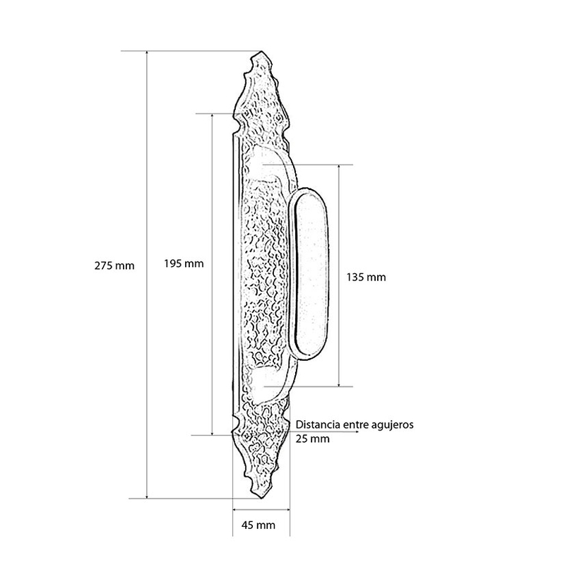 Este manillón está fabricado en aluminio con acabados en negro mate. De diseño rústico con placa de líneas ornamentales con extremos decorativos. Tiene unas medidas de 275×44 mm. Puedes consultar el croquis que tenemos colgado en nuestra web. Se presenta en una caja. En nuestra web tenemos el manillón de esta misma serie por si lo quieres combinar.