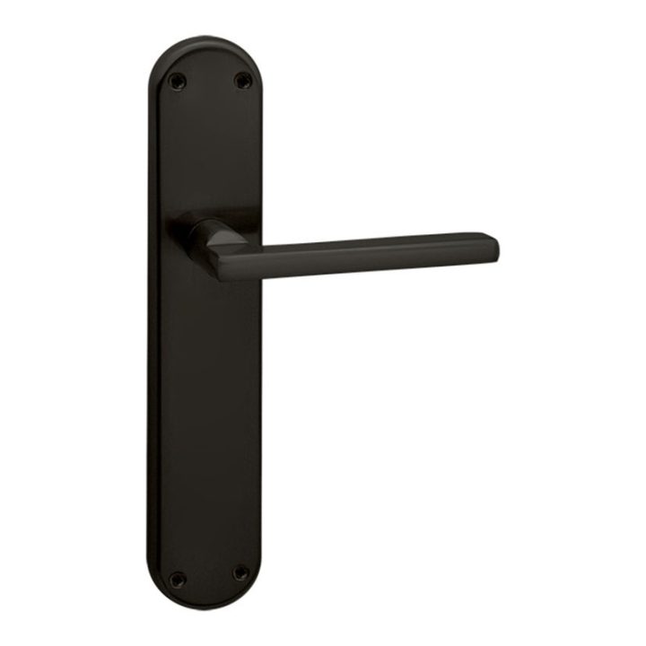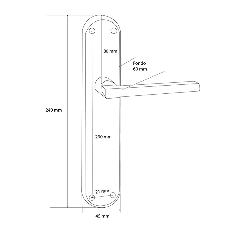 Manilla con placa de lineas rectas con extremos redondeados, fabricada en aluminio/Zamak de acabados en negro mate. Tiene unas medidas de 45xh.242, presentada en una caja. Puedes consultar el croquis que tenemos colgado en nuestra web.