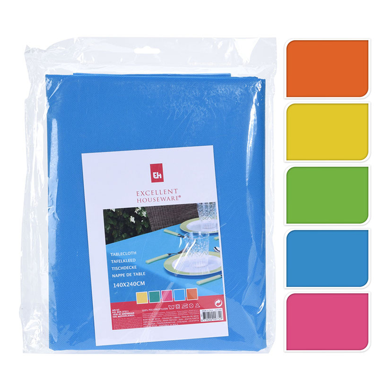Este mantel está fabricado en tejido no tejido. Se sirve en colores surtidos: azul, verde, fucsia, naranja y amarillo.