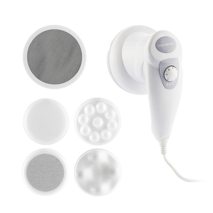 El masaje INNOVAGOODS Wellness Beuté es multifunción: masajeador, anticelulítico y cuidado de pies, dispone de varios cabezales intercambiables, por lo que es ideal para otros masajes corporales y para el cuidado de los pies. Está fabricado en materiales ABS y TPR, tiene una potencia de 28W e incorpora un botón on/off y regulador de intensidad. La velocidad de rotación es de hassta 3500 r.p.m, Incluye 5 accesorios: 4 cabezales: anticelulitis, masaje drenante y exfoliante y una malla protectora para zonas vellosas. Viene presentado en una caja y tiene 3 años de garantía. Puedes complementar la información con el video del proveedor que tenemos colgado en nuestra web.