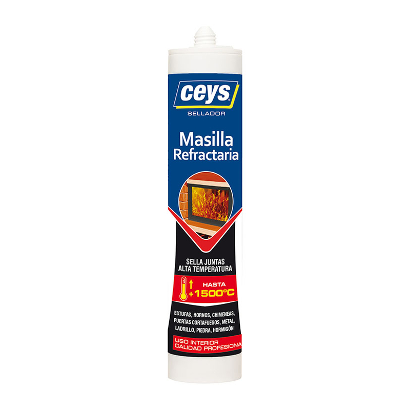 Sella y rellena juntas espuestas a alta temperatura (+1 500ºC). Masilla de base inorgánica especialmente indicada para la reparación de fisuras o para el sellado de juntas SIN MOVIMIENTO sometidas a altas temperaturas de 1,100ºC en continuo y hasta 1500ºC en puntas. Seca en color negro y no blanquea. Textura masilla rígida.