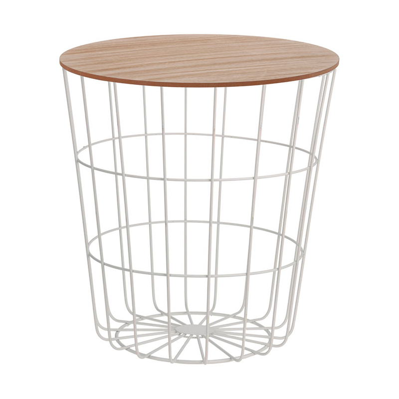 Esta mesita redonda tiene el tablero en madera apoyado en una base de varillas en acero. Es ideal para utilizar tanto como mesa auxiliar como cesto para revistas y otros objetos. Le darás un toque personal a tu estancia. Las dimensiones de la mesa son Ø39xh.41 cm.