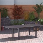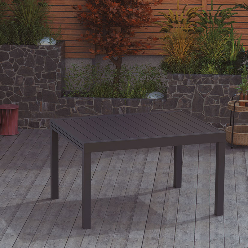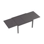 Esta mesa es extensible y tiene una estructura en aluminio con superficie de aluminio imitación. Puedes combinar un diseño elegante junto con las sillas de esta misma serie, para poder difrutar de tus ratos de ocio y descanso en tu jardín, terraza o patio. Ya nos puedes solicitar las sillas en nuestra página web. La mesa tiene unas dimensiones de 130/260×100 y una altura de 76 cm. Se sirve desmontada en una caja