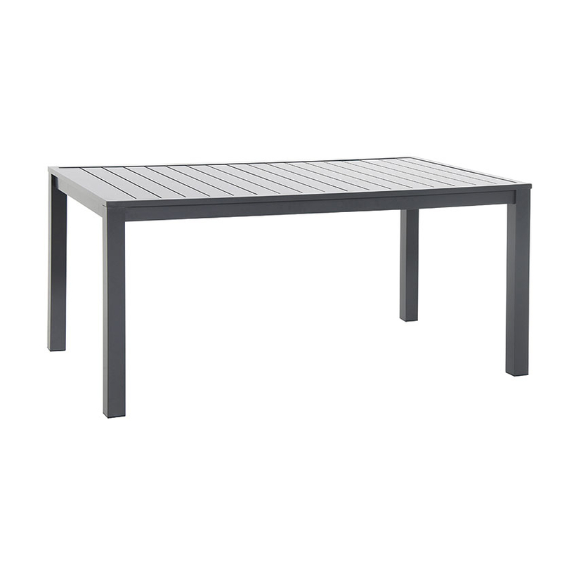 Esta mesa es fija y tiene una estructura en aluminio con superficie de aluminio imitación. Puedes combinar un diseño elegante junto con las sillas de esta misma serie, para poder difrutar de tus ratos de ocio y descanso en tu jardín, terraza o patio. Ya nos puedes solicitar las sillas en nuestra página web. La mesa tiene unas dimensiones de 160×90 y una altura de 74 cm. Se sirve desmontada en una caja