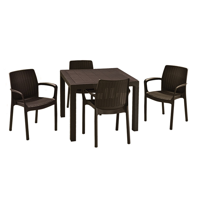 La resina inyectada, es un material plástico de alta densidad. Su naturaleza lo hace ligero y muy maleable, pudiendo adoptar formas y diseños muy atractivos. La nueva generación de muebles de resina cuentan con una protección anti-rayos UVA que evita que se decoloren con el sol. Son muebles ideales para exterior ya que no sufren oxidaciones.